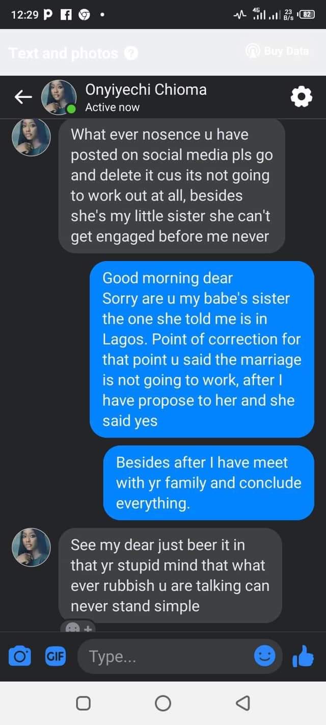 The lady identified as Onyinyechi Daniel sent hot messages to her sister’s fiance informing him that the union cannot hold.
