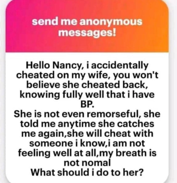 “Hello Nancy, I accidentally cheated on my wife, you won’t believe she cheated back, knowing fully well that i have BP.