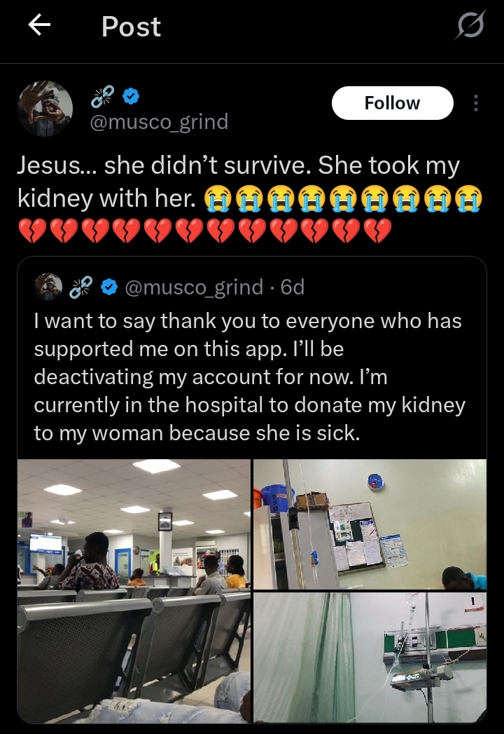 Announcing the demise of his wife , he tweeted, “Jesus, she didn’t survive. She took my kidney with her. 😭😭😭😭😭😭😭😭😭💔💔💔💔💔💔💔💔💔💔💔💔”.