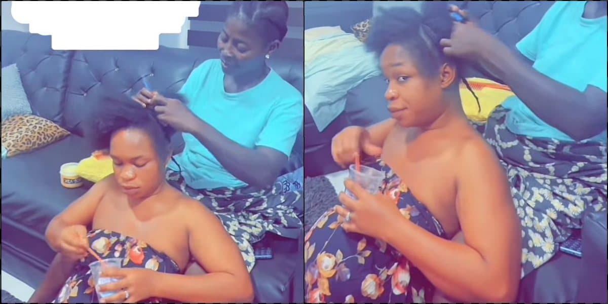 In a heartwarming video, her mother-in-law was captured delicately styling her hair in their living room while the lady was eating.