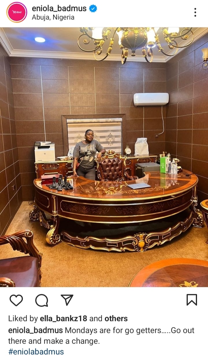 Popular Nollywood actress Eniola Badmus has shown off her luxury well-furnished office shortly after Tinubu resumed office.