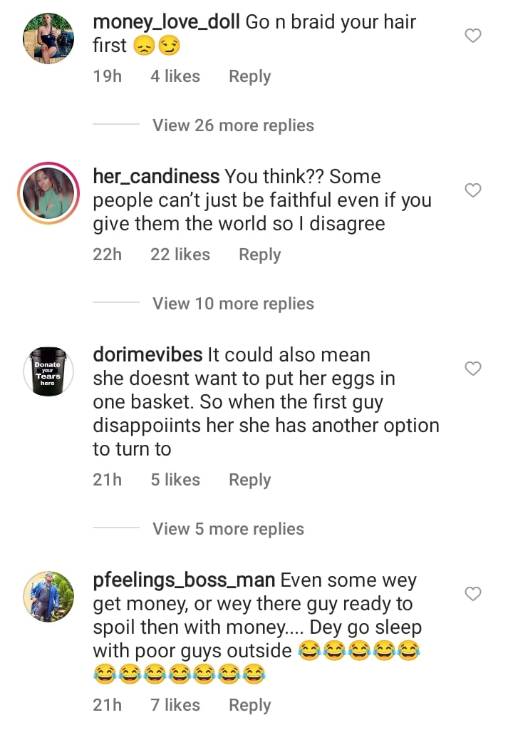 According to the lady, the main reason a lot of women get into relationship with more than one man is because they have no money of their own.