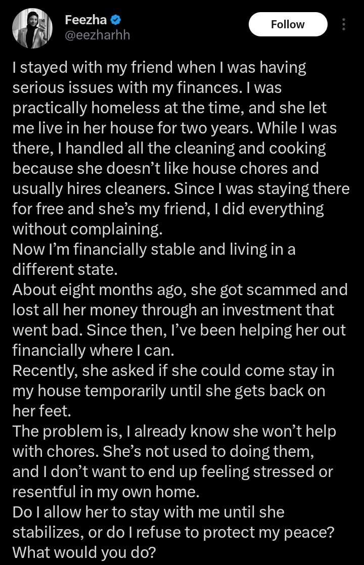 A lady has sparked conversation online after sharing a dilemma involving a long-time friend who once offered her shelter during a period of financial hardship.