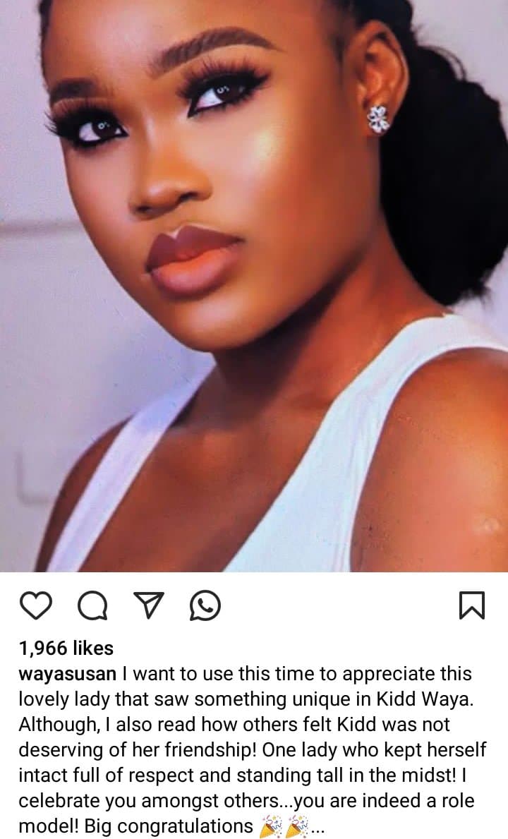 The socialite took to her Instagram page to pen down an appreciation post to CeeC about her friendship with Kiddwaya while in the house.