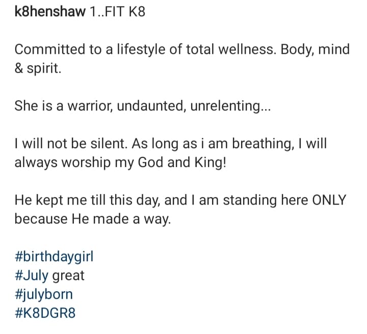 “Committed to a lifestyle of total wellness. Body, mind & spirit. She is a warrior, undaunted, unrelenting. I will not be silent. As long as i am breathing, I will always worship my God and King!