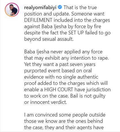 Giving an update about his embattled colleague, Yomi Fabiyi affirmed in an Instagram post that the minor in question never in any situation claimed that Baba Ijesha had carnal knowledge of her.