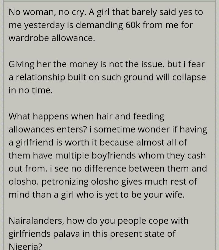 What happens when hair and feeding allowances enters? i sometime wonder if having a girlfriend is worth it because almost all of them have multiple boyfriends whom they cash out from. i see no difference between them and olosho. petronizing olosho gives much rest of mind than a girl who is yet to be your wife.