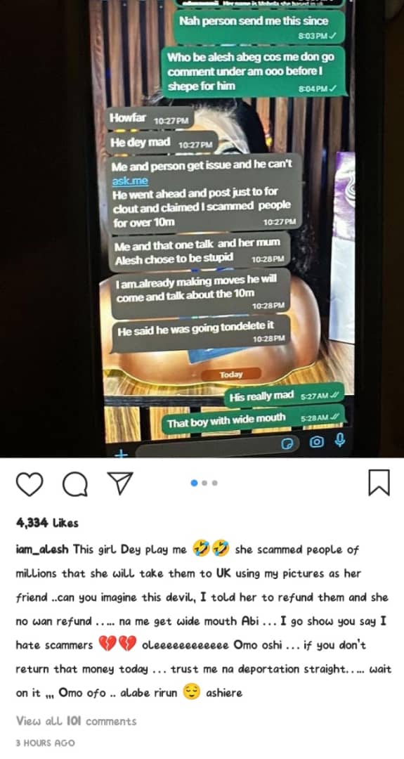 “This girl Dey play me. She scammed people of millions that she would take them to the UK using my pictures as her friend… Can you imagine this devil, I told her to refund them and she no wan refund ….. na me get wide mouth Abi … I go show you say I hate scammers. oleeeeeeeeeeee Omo oshi … if you don’t return that money today … trust me na deportation straight….. wait on it ,,, Omo ofo .. alabe rirun Ashiere”.