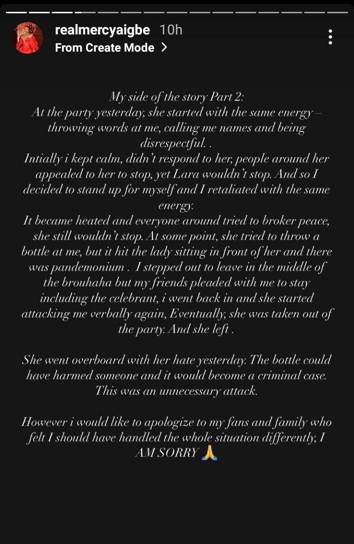 “She tried to throw a bottle at me, but it hit somebody else” – Mercy Aigbe shares her side of story after messy fight with Larrit