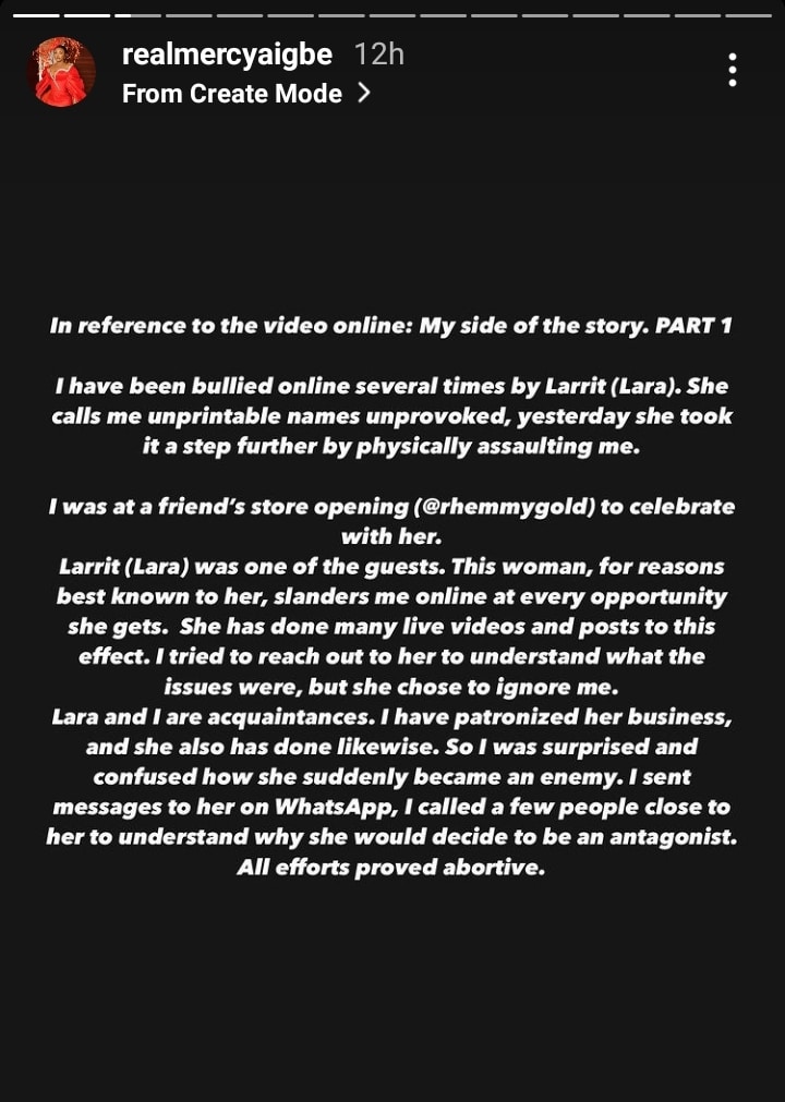 According to the thespian, the Lagos socialite, Lara Olukotun (Larrit) had been bullying her for sometime, online, calling her unprintable names and has decided to go physical with her when they met at an event.