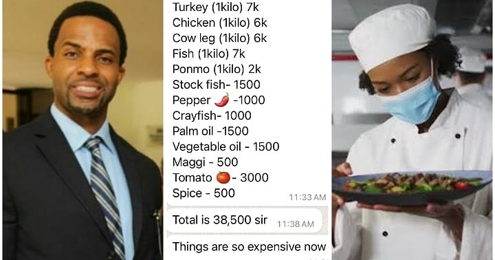 According to the list, a kilogram of turkey was priced at N7,000, chicken at N6,000, fish at N6,000, cow leg at N6,000 per kilogram, ponmo (cow skin) at N2,000 per kilogram, stockfish at N1,500, pepper at N1,000, crayfish at N1,000, palm oil at N1,500, vegetable oil at N1,500, Maggi seasoning at N500, tomato at N3,000, spice at N500, and vegetables at N2,000.