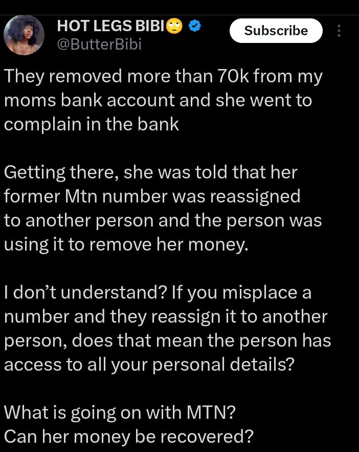 ”I don’t understand? If you misplace a number and they reassign it to another person, does that mean the person has access to all your personal details?.What is going on with MTN?. Can her money be recovered?”, Her tweet reads.