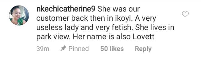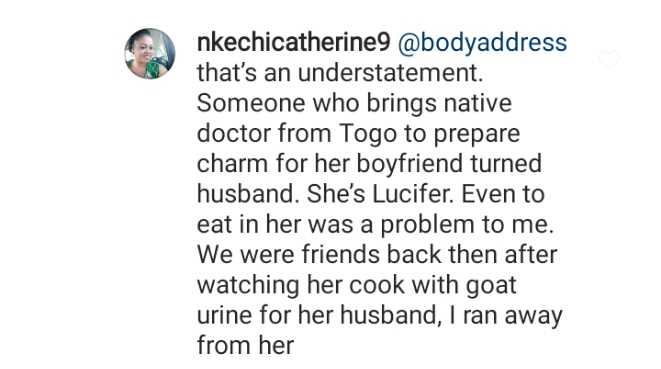 “She was our customer back then in Ikoyi. A very use less lady and very fetish. A demon is an understatement. Someone who brings native doctor from Togo to prepare charm for her boyfriend turned husband. She’s a Lucifer. Even to eat in her was a problem to me. We were friends back then and after watching her cook with goat urine for her husband, I ran away from her”.