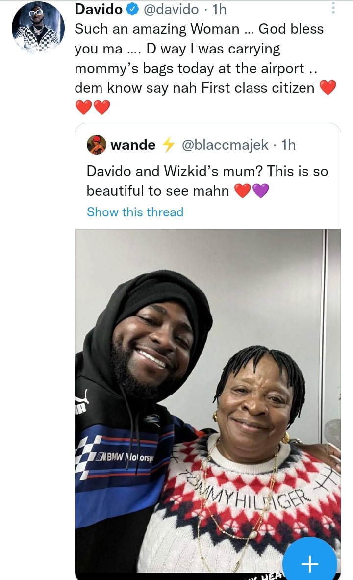 A Twitter user had shared a snapshot of Wizkid’s mother and Davido all smiles; the Tweep expressed how beautiful it is to see the duo in a picture together.