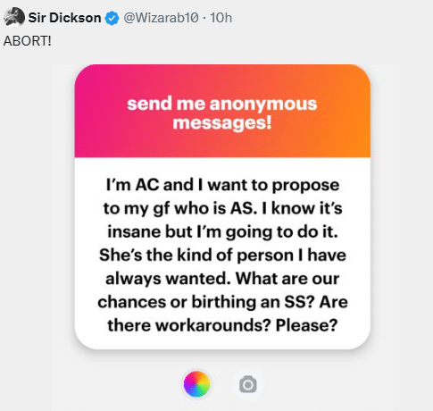 “I’m AC and I want to propose to my gf who is AS. I know it’s insane but I’m going to do it. She’s the kind of person I have always wanted. What are our chances or birthing an SS? Are there workarounds? Please?”
