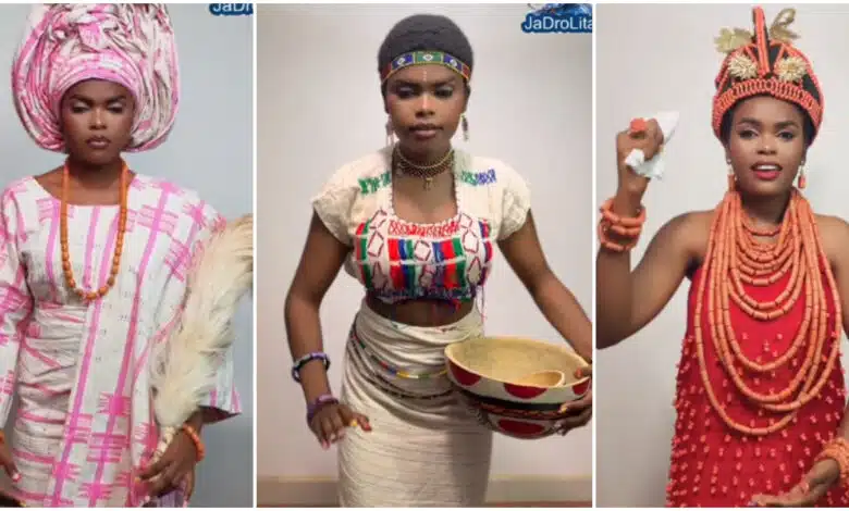 In the video, which has quickly gone viral, Jadro Lita was seen wearing traditional attire representing different Nigerian tribes, including Igbo, Hausa, Yoruba, and Benin.