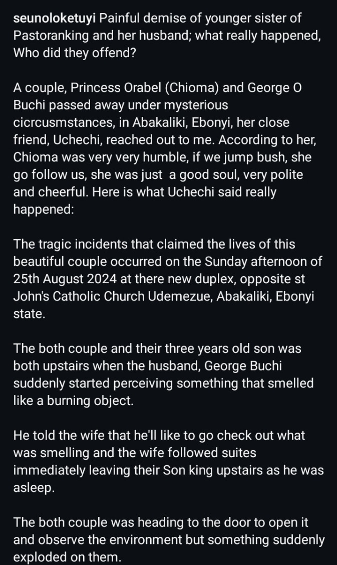 Gistreel had earlier reported on the death which sent shock wave down the spine of Nigerians. Instagram blogger, Cutie Juls announced the tragic passing of the couple, revealing a gas explosion incident ensued at their home.