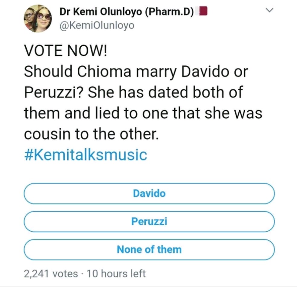 “VOTE NOW! Should Chioma marry Davido or Peruzzi? She has dated both of them and lied to one that she was cousin to the other.”