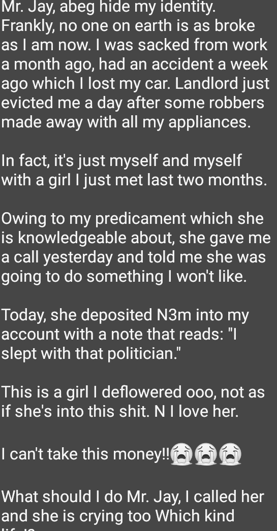 In his words: “Mr. Jay, abeg hide my identity. Frankly, no one on earth is as broke as I am now. I was sacked from work a month ago, had an accident a week ago which I lost my car. Landlord just evicted me a day after some robbers made away with all my appliances.