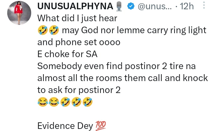 “What did I just hear 🤣🤣 may God nor lemme carry ring light and phone set oooo. E choke for SA. Somebody even find postinor 2 tire na almost all the rooms them call and knock to ask for postinor 2😂😂🤣🤣🤣