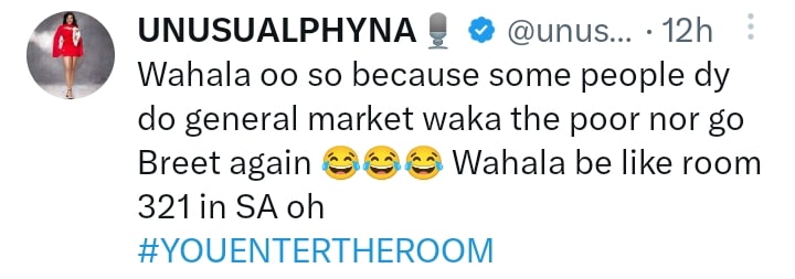 Evidence Dey 💯Wahala oo so because some people dy do general market waka the poor nor go Breet again 😂😂😂 Wahala be like room 321 in SA oh#YOUENTERTHEROOM