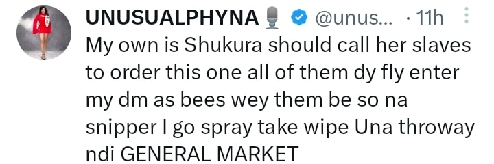 My own is Shukura should call her slves to order this one all of them dy fly enter my dm as bees wey them be so na snipper I go spray take wipe Una throway ndi GENERAL MARKET”