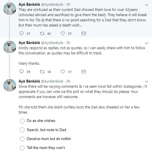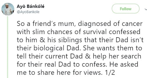 A Nigerian man and his siblings are currently in a dilemma after their mum who is down with terminal cancer, revealed to them that the man they have called Daddy for over 32 years, is not their biological father.