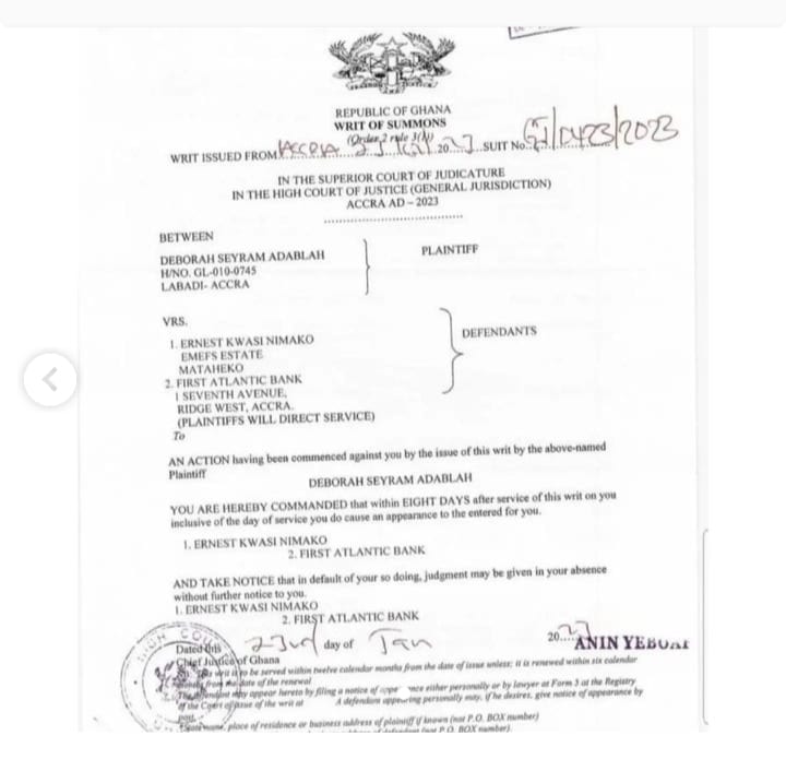 A Ghanaian lady, Deborah Seyram Adablah, has sued the Director of Finance of First Atlantic Bank, Ernest Kwasi Nimako, for allegedly breaching an agreement to take care of her.