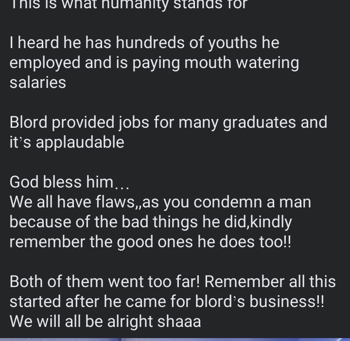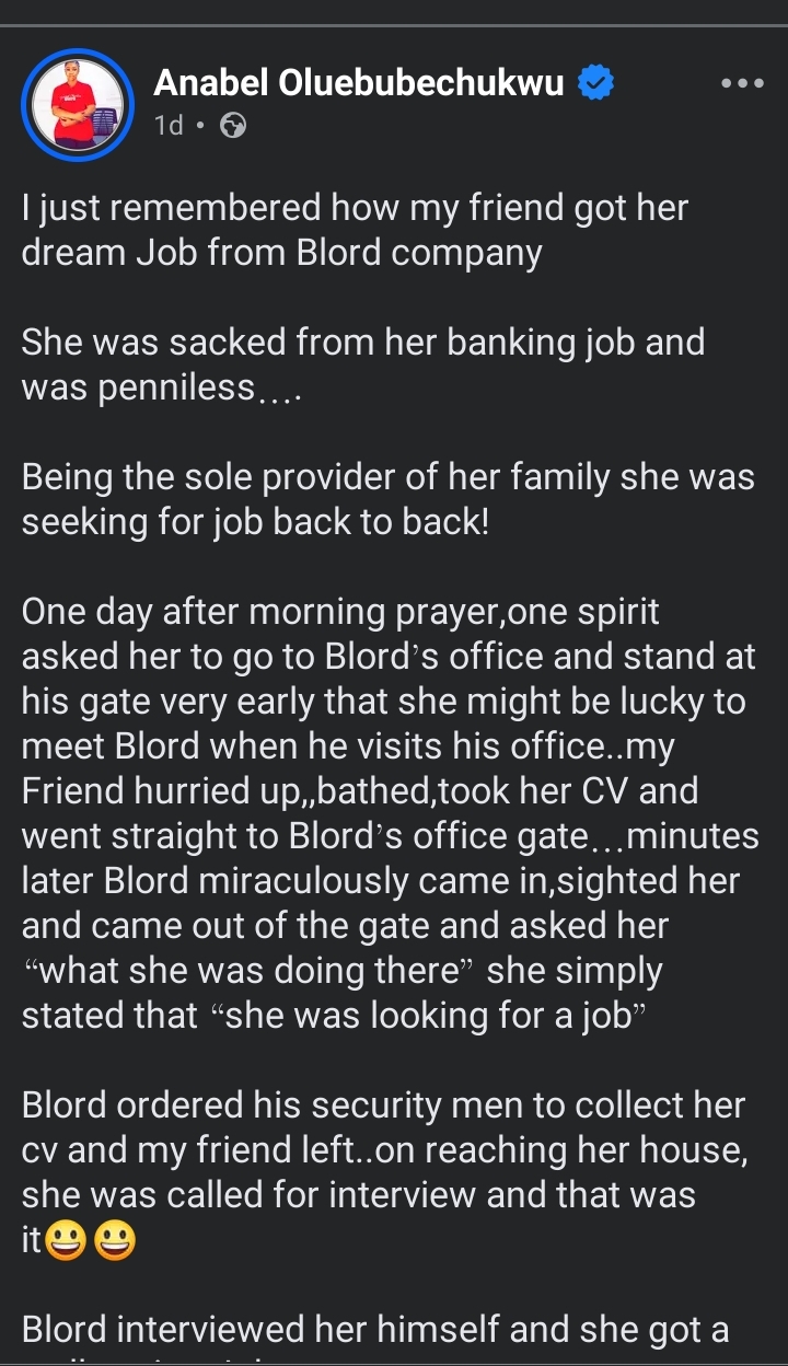 Sharing details of her friend’s encounter with Blord, Anabel Oluebuechukwu narrated, “Blord ordered his security men to collect her cv and my friend left..on reaching her house,she was called for interview and that was it.Blord interviewed her himself and she got a well paying Job. This is what humanity stands for”.
