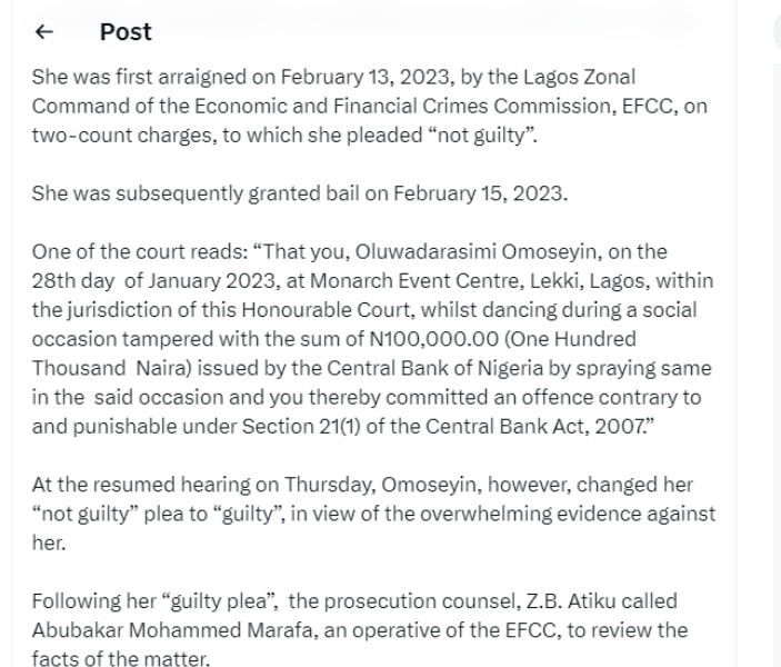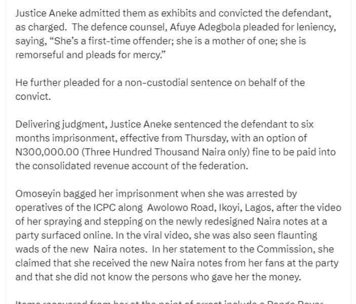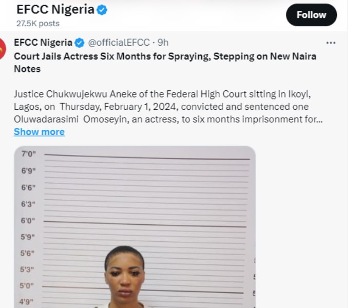 On Thursday, February 1, 2024, Justice Chukwujekwu Aneke of the Federal High Court sitting in Ikoyi, Lagos, convicted and sentenced actress Oluwadarasimi Omoseyin to six months in prison for spraying and walking on fresh Naira notes during a social event in Lagos.