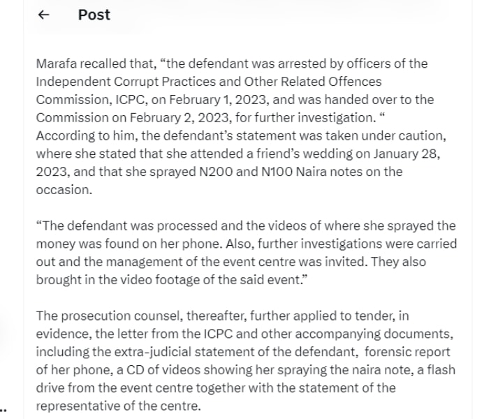 One of the court reads: “That you, Oluwadarasimi Omoseyin, on the 28th day of January 2023, at Monarch Event Centre, Lekki, Lagos, within the jurisdiction of this Honourable Court, whilst dancing during a social occasion tampered with the sum of N100,000.00 (One Hundred Thousand Naira) issued by the Central Bank of Nigeria by spraying same in the said occasion and you thereby committed an offence contrary to and punishable under Section 21(1) of the Central Bank Act, 2007.”
