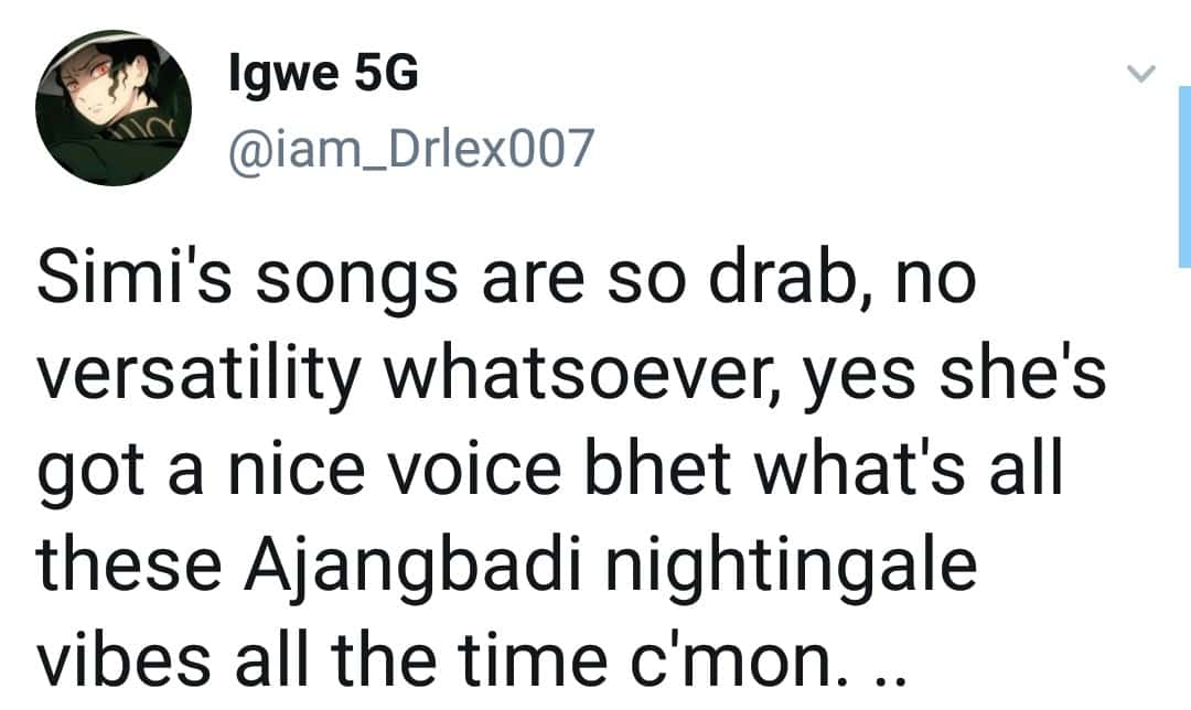 “Simi’s songs are so drab, no versatility whatsoever, yes she’s got a nice voice bhet what’s all these Ajangbadi nightingale vibes all the time c’mon.”