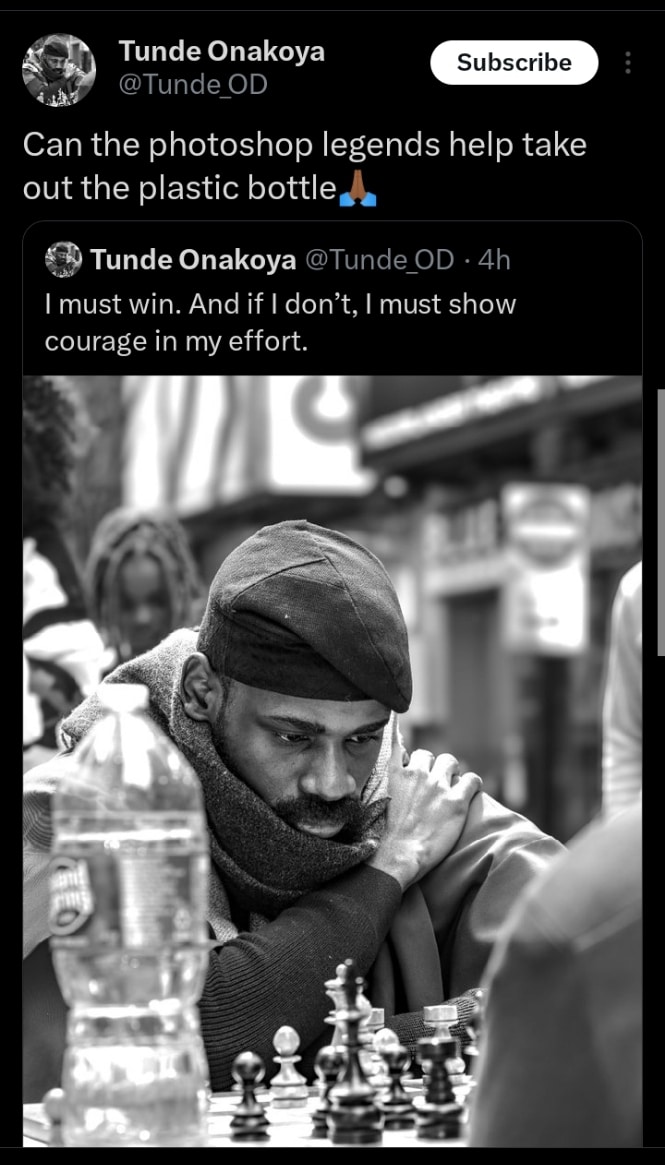 Tunde Onakoya, who is the holder of Guinness World Record’s longest chess marathon, called on photoshop legends to remove a plastic bottle in his viral photo.
