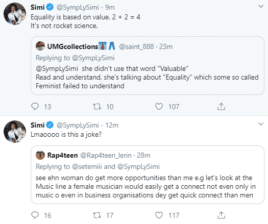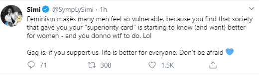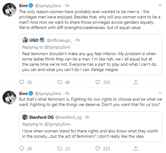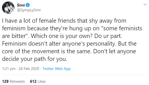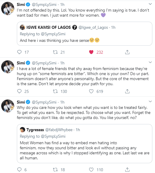 Simi took to Twitter to speak about feminism and also to reply to followers who did not agree with her views on feminism.