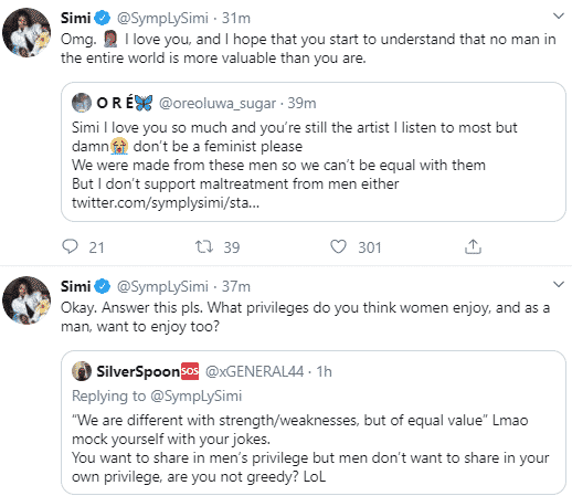 A female Twitter user reacted, writing: “Simi I love you so much and you’re still the artist I listen to most but damn don’t be a feminist please We were made from these men so we can’t be equal with them But I don’t support maltreatment from men either.”
