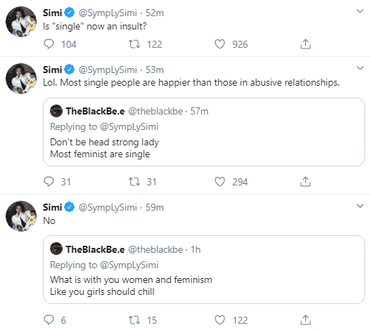@theblackbe said to Simi: “Don’t be head strong lady Most feminist are single.”