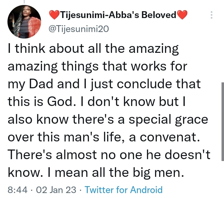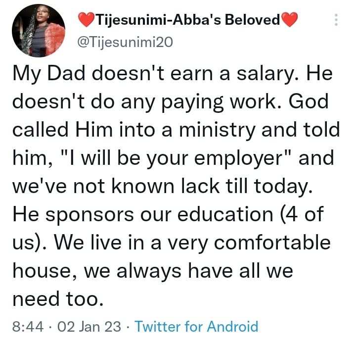 A young lady has revealed that her family has never known lack since her dad, who doesn’t do any paid work, was called into the ministry.