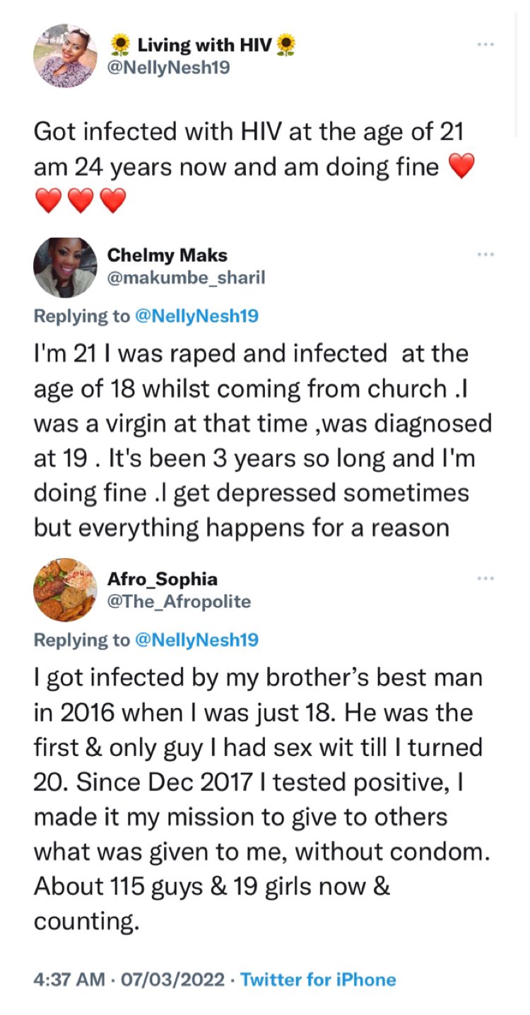 “I got infected by my brother’s best man in 2016 when I was just 18. He was the first & only guy I had sex wit till I turned 20. Since Dec 2017 I tested positive, I made it my mission to give to others what was given to me, without condom. About 115 guys & 19 girls now & counting.”