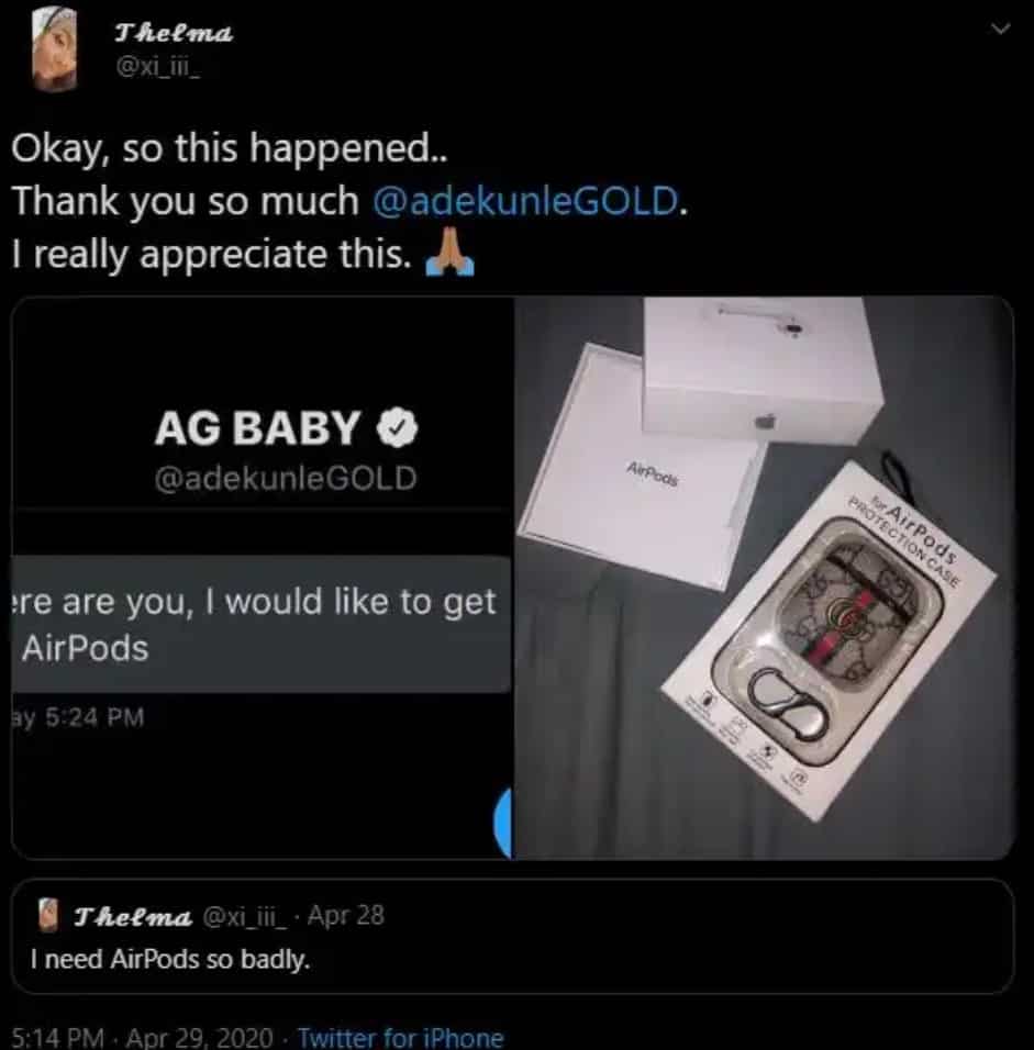 Nigerian highlife singer and songwriter, Adekunle Gold recently put smiles on the face of one of his followers who said she needed an Airpod badly.