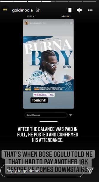 A show promoter identified on Instagram as goldmoola has called out the popular singer, Burna Boy and his mother, Bose Ogulu for allegedly trying to extort him of more funds after payment for a show was already completed.