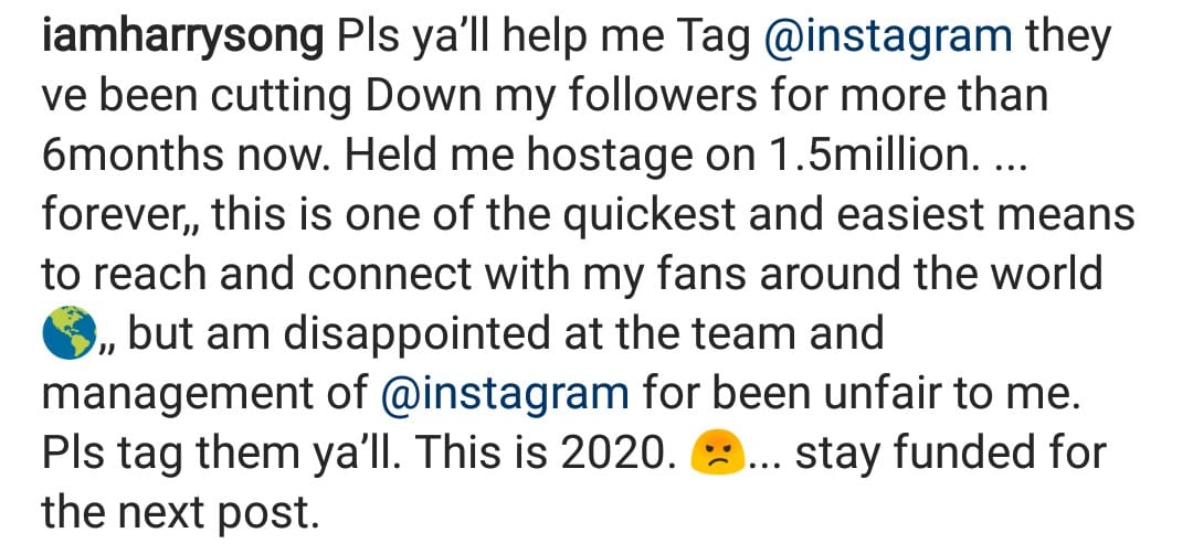 “Pls ya’ll help me Tag @instagram they ve been cutting Down my followers for more than 6months now. Held me hostage on 1.5million. … forever,, this is one of the quickest and easiest means to reach and connect with my fans around the world,, but am disappointed at the team and management of @instagram for been unfair to me. Pls tag them ya’ll. This is 2020…. stay funded for the next post”.