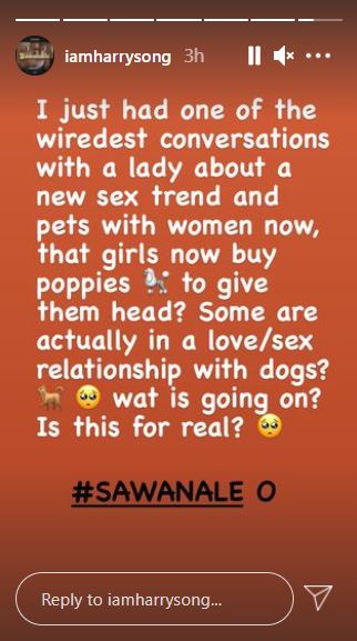 He took to his Instagram story to share an update from a conversation he had with a lady. According to him, the lady told him some women buy dogs to perform oral s$x on them.