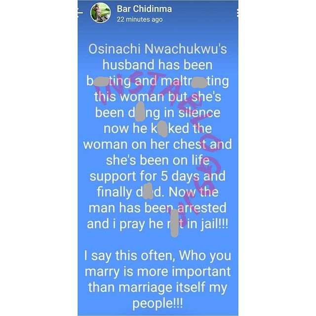 According to a report made by Instablog, one of her friends alleged that the singer had been enduring maltreatment from her husband until he kicked her in the chest which resulted in her being on life support for 5 days before she finally died.