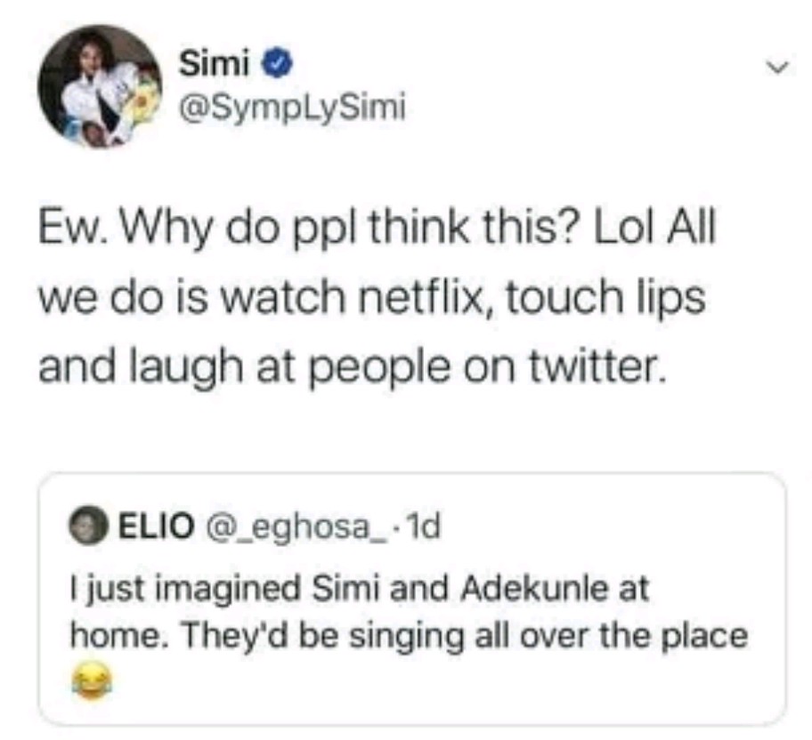 “I just imagined Simi and Adekunle at home. They’d be singing all over the place”.