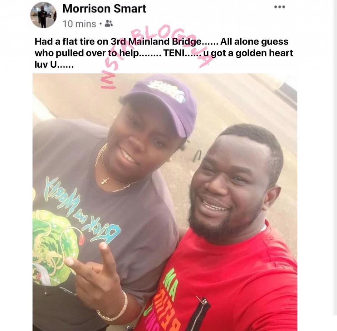 “Had a flat Tyre on 3rd mainland Bridge. All alone guess who pulled over to help. Teni. U got a golden heart. Love u”.