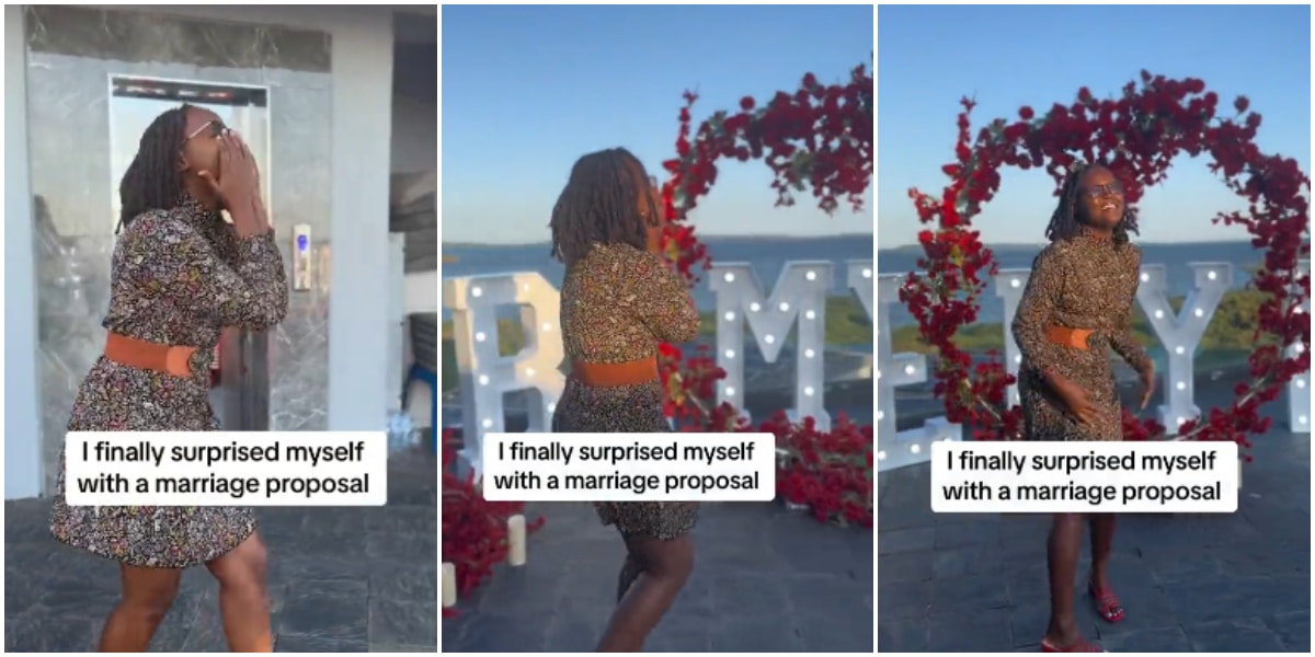 A single young lady has captured the attention of many online after a video surfaced of her proposing marriage to herself.