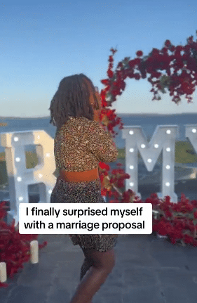 The video, captioned “I finally surprised myself with a marriage proposal,” shows @macshina orchestrating a proposal scene for herself.