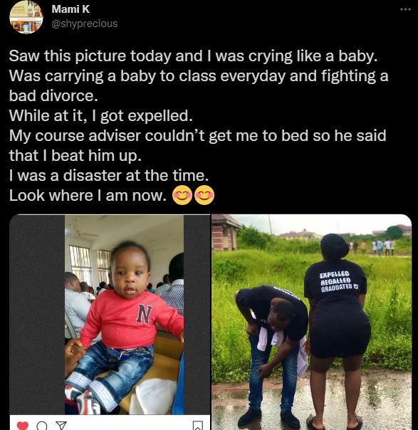 The lady took to the bird app to share a bit of her survival story as she narrated how she carried her son to classes on daily basis after a painful divorce.