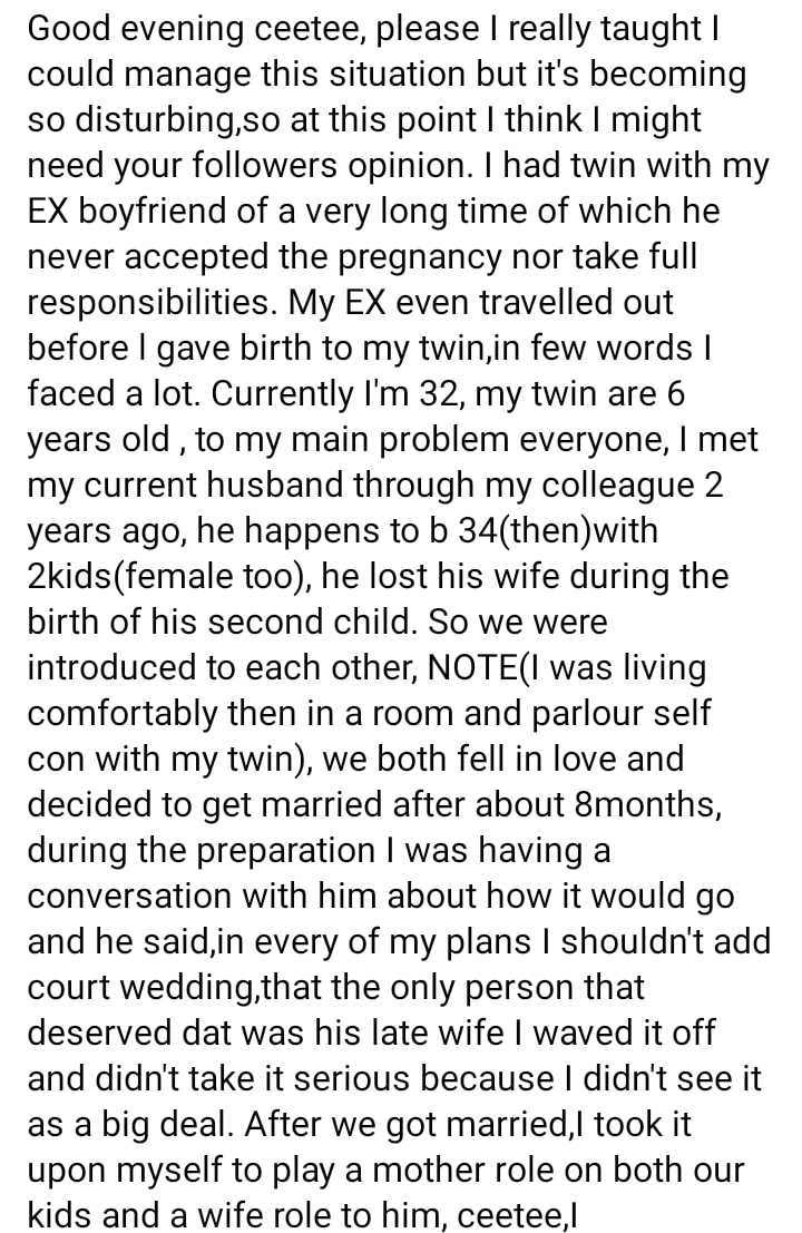 Currently I’m 32, my twin are 6 years old , to my main problem everyone, I met my current husband through my colleague 2 years ago, he happens to b 34 (then) with 2kids(female too), he lost his wife during the birth of his second child. So we were introduced to each other, NOTE(I was living comfortably then in a room and parlour self con with my twin), we both fell in love and decided to get married after about 8months, during the preparation I was having a conversation with him about how it would go and he said,in every of my plans I shouldn’t add court wedding,that the only person that deserved dat was his late wife I waved it off and didn’t take it serious because I didn’t see it as a big deal.