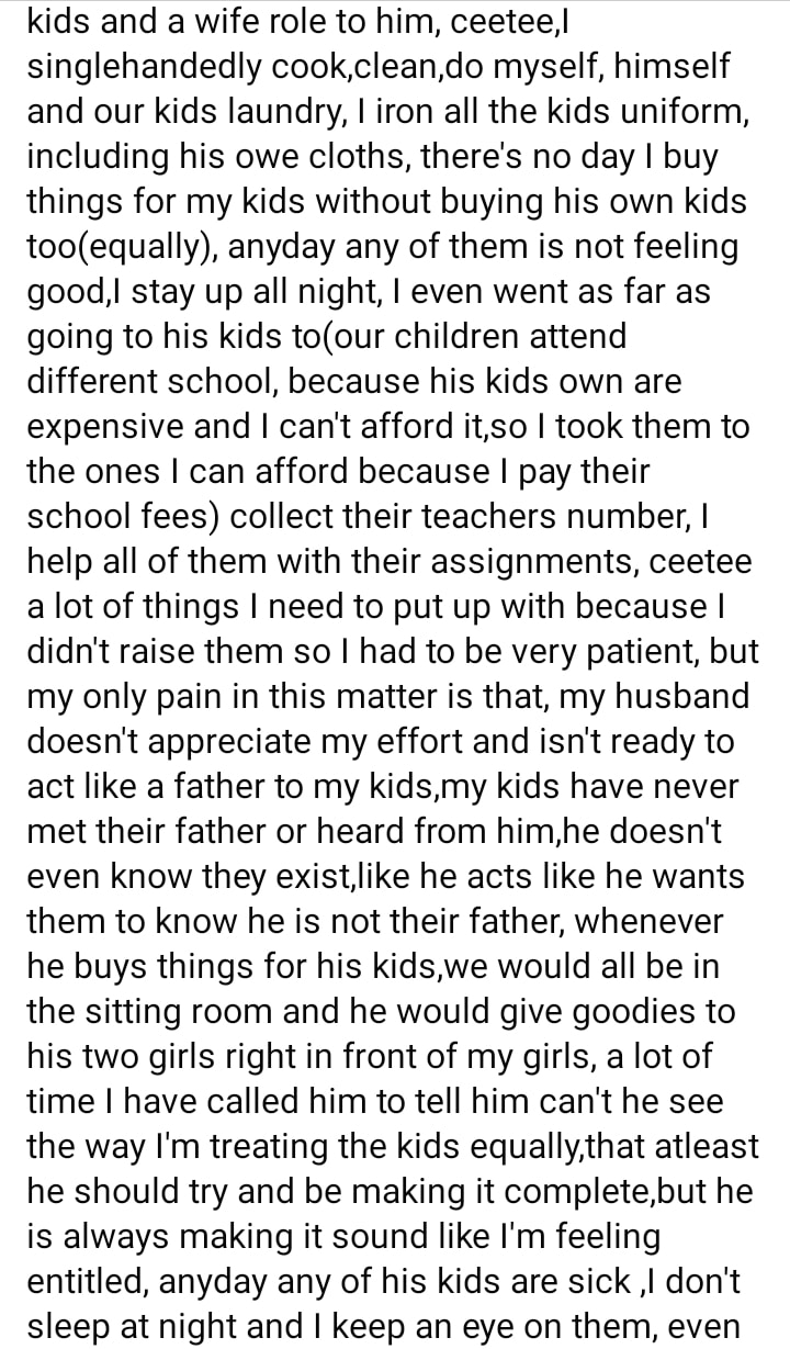 After we got married,I took it upon myself to play a mother role on both our kids and a wife role to him, ceetee,I singlehandedly cook,clean,do myself, himself and our kids laundry, I iron all the kids uniform, including his owe cloths, there’s no day I buy things for my kids without buying his own kids too(equally), anyday any of them is not feeling good,I stay up all night, I even went as far as going to his kids to(our children attend different school, because his kids own are expensive and I can’t afford it,so I took them to the ones I can afford because I pay their school fees) collect their teachers number, I help all of them with their assignments, ceetee a lot of things I need to put up with because I didn’t raise them so I had to be very patient, but my only pain in this matter is that, my husband doesn’t appreciate my effort and isn’t ready to act like a father to my kids,my kids have never met their father or heard from him,he doesn’t even know they exist,like he acts like he wants them to know he is not their father, whenever he buys things for his kids,we would all be in the sitting room and he would give goodies to his two girls right in front of my girls, a lot of time I have called him to tell him can’t he see the way I’m treating the kids equally,that atleast he should try and be making it complete,but he is always making it sound like I’m feeling entitled.